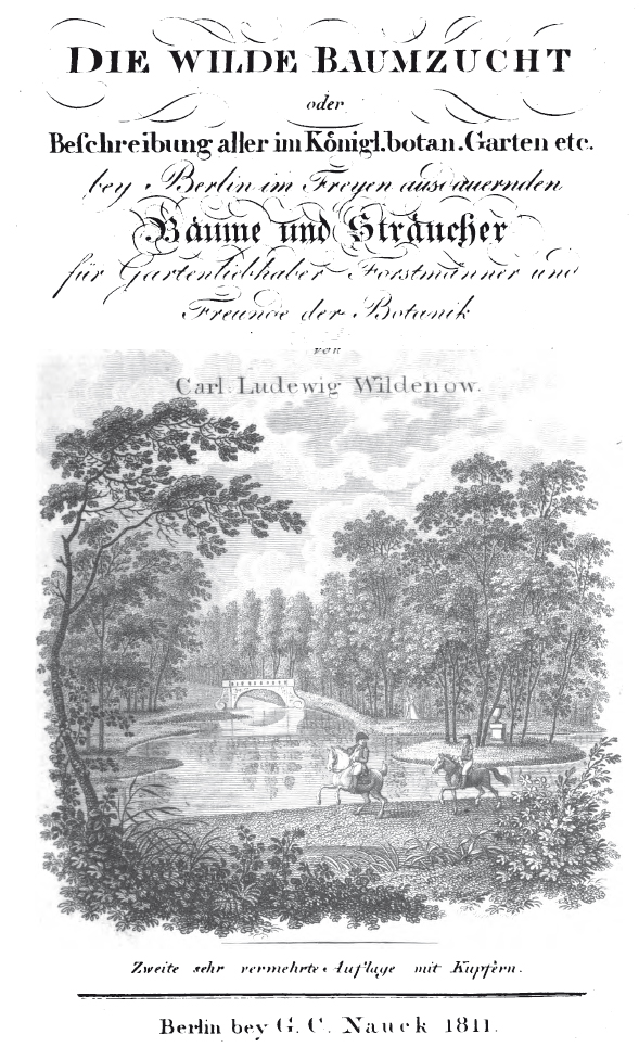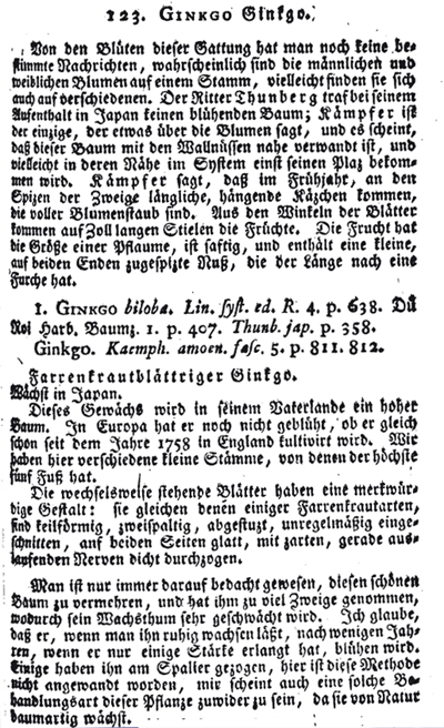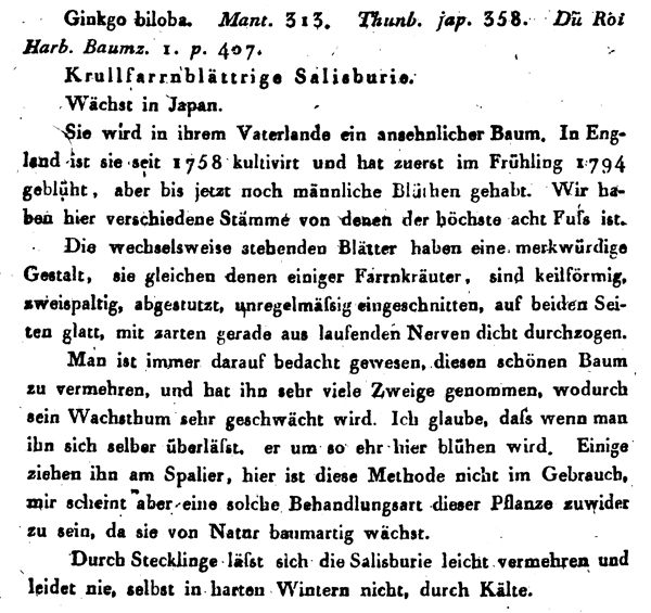 Im Jahr 1796 beschrieb Carl Ludwig Willdenow in seinem Buch "Berlinische Baumzucht oder Beschreibung, der in den Gärten um Berlin, im Freien ausdauernden Bäume und Sträucher für Gartenliebhaber und Freunde der Botanik" als einer der ersten den Ginkgo | ![]() |
